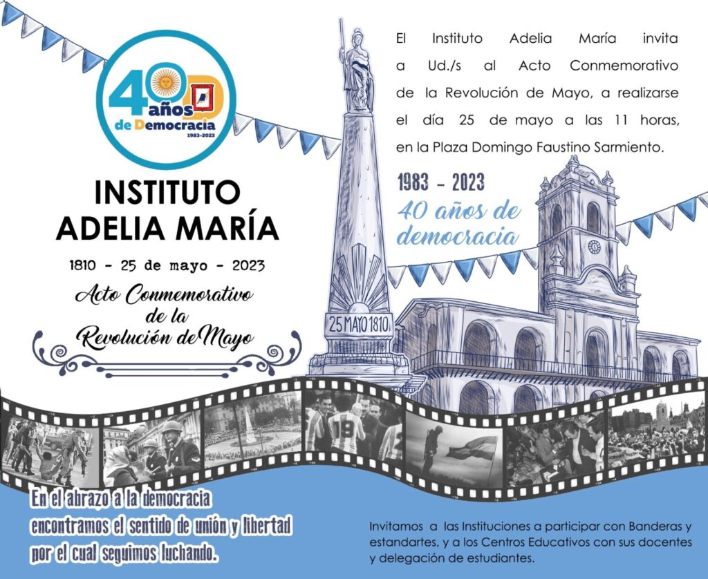 El Instituto de Adelia María invita a todos los vecinos de la localidad a presenciar el Acto Conmemorativo de la Revolución de Mayo, el mismo se realizará el día Jueves 25 de Mayo a partir de las 11 hs en la Plaza Domingo F. Sarmiento.
