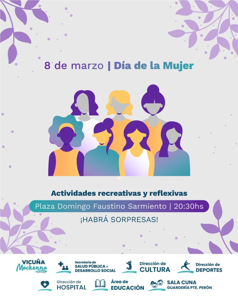 La Municipalidad de Vicuña Mackenna invita a participar de un encuentro para celebrar el Día de la Mujer, el Miércoles 8 de Marzo en la Plaza Domingo F. Sarmiento.