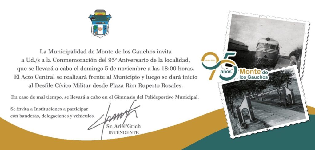 La Municipalidad de Monte de los Gauchos invita a los vecinos a participar el día Domingo 5 de Noviembre del Acto Protocolar por la fundación del pueblo.