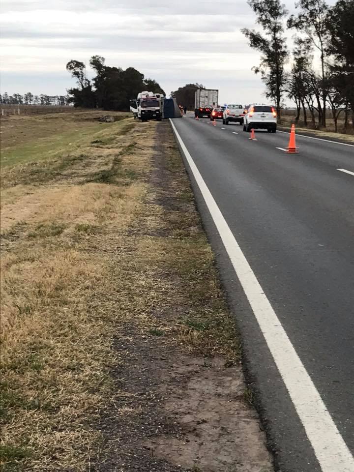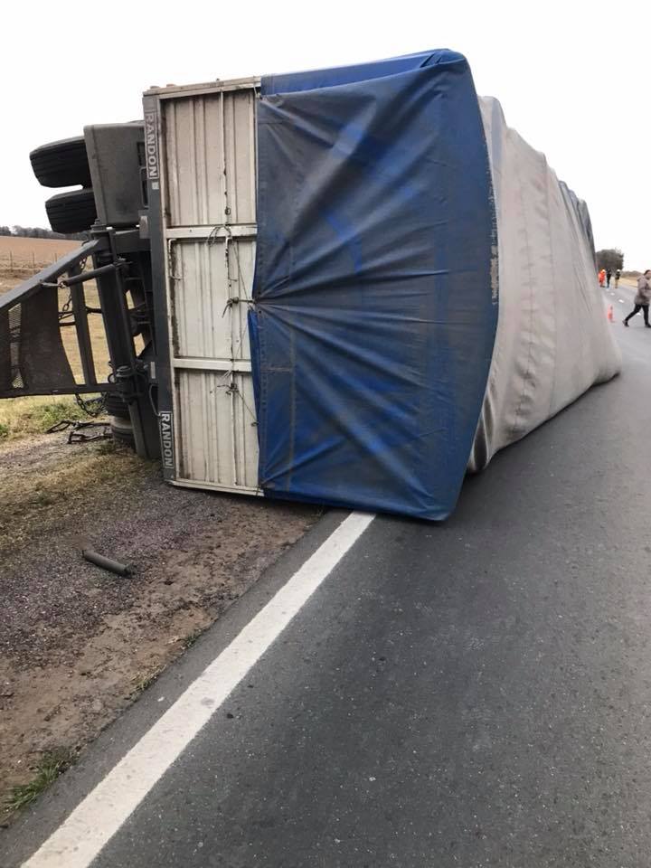 Llegado al lugar se encontró que se habría producido un vuelco del acoplado de un camión, se constata que no hay personas lesionadas y se realiza un corte preventivo de media calzada ya que el camion marca Fiat Cursor dominio LUQ586 y su acoplado marca Randon dominio IJT554 esta volcada sobre la carpeta asfaltica, cargada con 8mil kilos de fertilizante, no desparramando la carga. Se mantiene el corte de media calzada mientras traspasaban la carga para poder parar el acoplado. Dicho rodado lo hacia desde la zona rural Ensenadas a la localidad de San Basilio, perteneciente a la empresa local de R y G Sgarlatta.