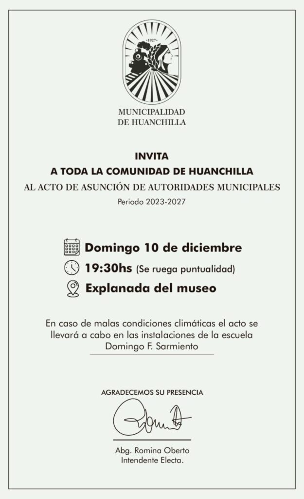 La Municipalidad de Huanchilla invita a la comunidad a presenciar el Acto de Asunción de Autoridades Electas este Domingo 10 de Diciembre a partir de las 19:30 hs.