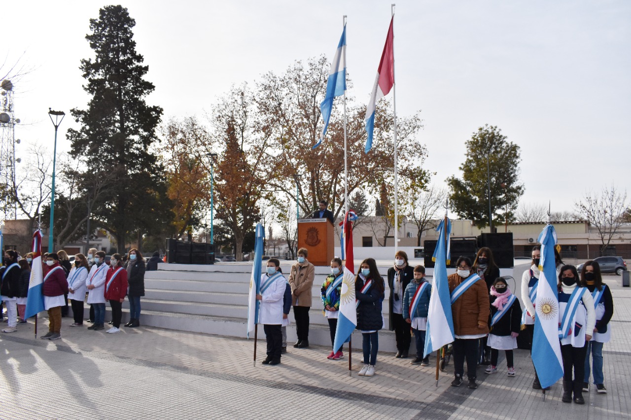 En la Plaza Domingo Faustino Sarmiento, este Martes 21 de Junio, la Inspectora Técnica de Zona 4140, Prof. María Rosa Cabral, junto a los ex combatientes Pablo Mana y Juan Ángel Machó, realizó la toma de lealtad a estudiantes de 4to grado de Centros Educativos de Nivel Primario de la ciudad.