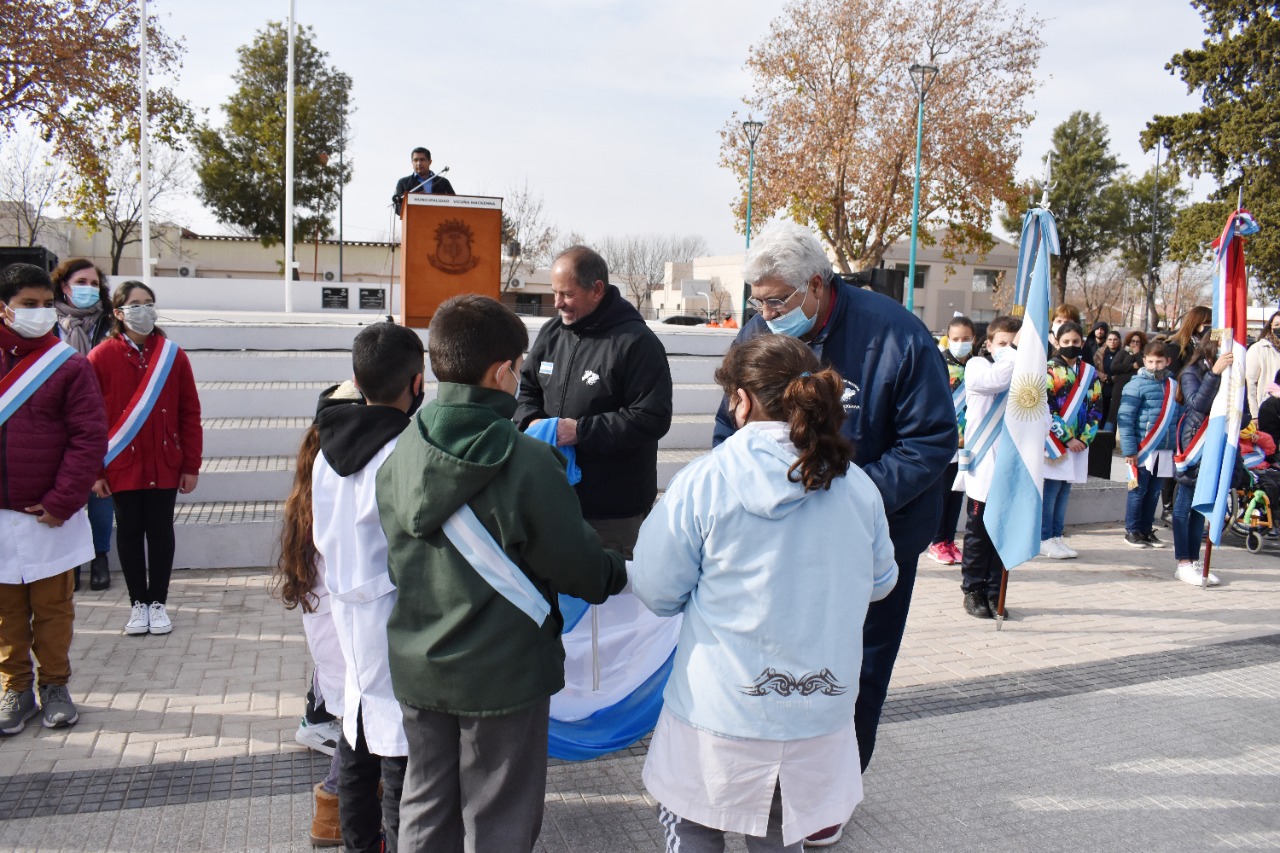 El Intendente de la ciudad, Roberto Casari, acompañado por diversos funcionarios municipales, destacó la importancia de honrar a la bandera nacional. Al finalizar el acto, en el marco del 40° Aniversario de la Guerra de Malvinas, estudiantes de 4to grado entregaron una bandera argentina de flameo a los ex combatientes, para que la misma sea utilizada en el Monumento a los Veteranos de Guerra de Vicuña Mackenna.
