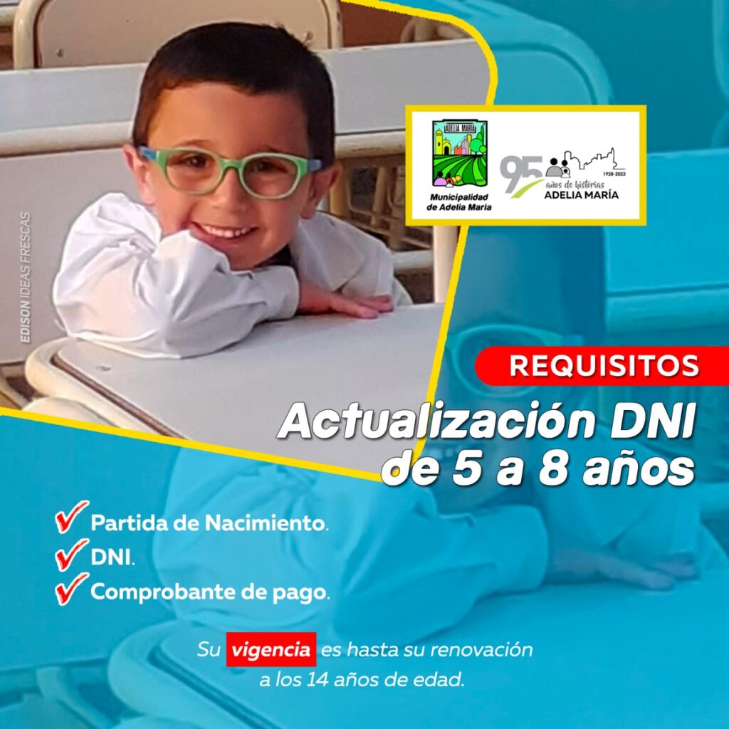 La Oficina del Registro Civil de la Municipalidad de Adelia María informa cuales son los requisitos para actualizar el DNI de tu hijo/a de 5 a 8 años.