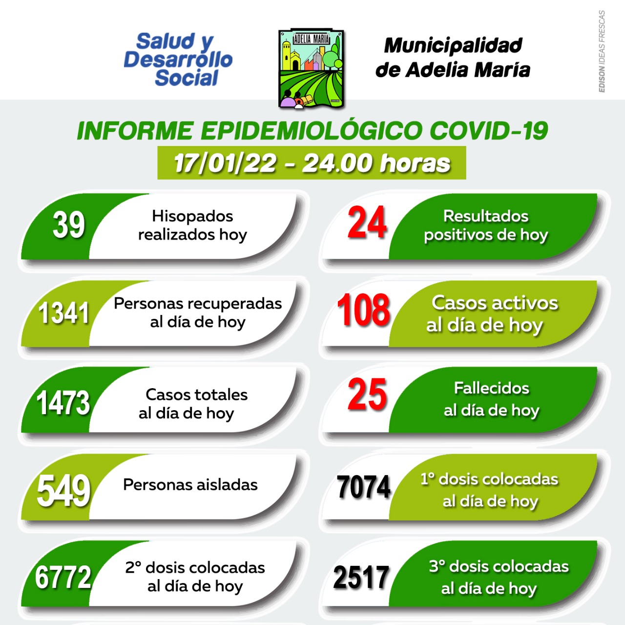 La Municipalidad de Adelia María informó que en la jornada de ayer se han detectado 24 nuevos casos positivos para Covid-19.
