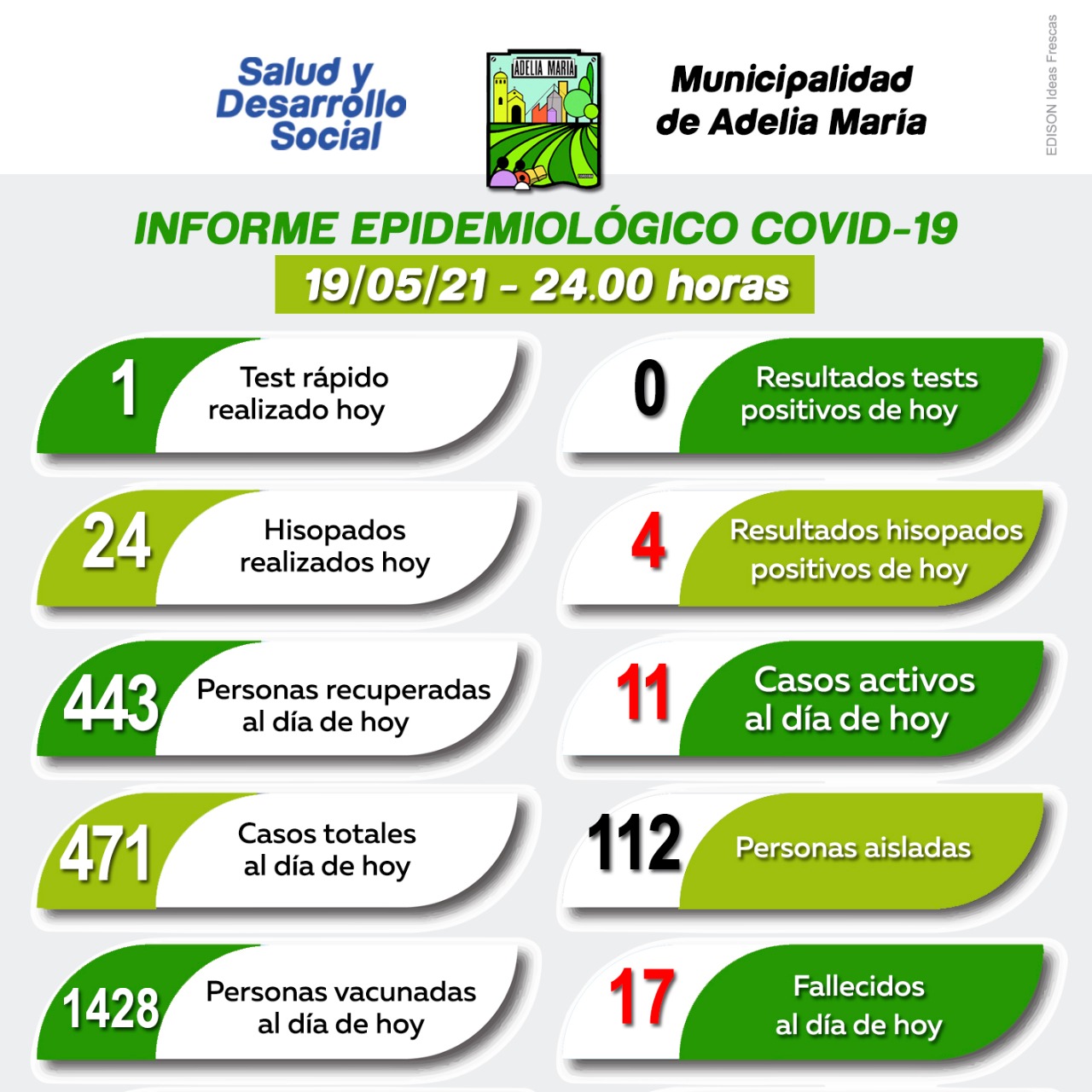 La Municipalidad de Adelia María informó que en la jornada de ayer se registraron cuatro nuevos casos positivos de coronavirus.
