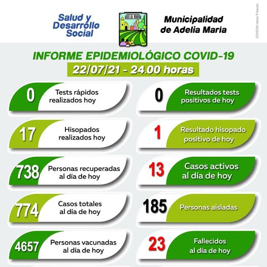Adelia María tiene 13 casos activos de coronavirus