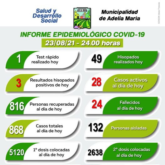 La Municipalidad de Adelia María informó que se han detectado tres nuevos casos positivos para Covid-19. Además, cuatro pacientes que cursaban la enfermedad recibieron el alta. De