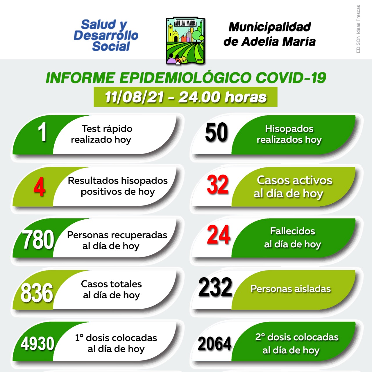 La Municipalidad de Adelia María informó que se han detectado cuatro nuevos casos positivos para Covid-19. Además, un paciente que cursaba la enfermedad recibió el alta médica. De esta manera, son 32 los casos activos en la localidad.