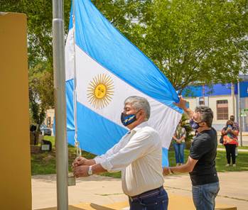 En la emotiva ceremonia a 200 años del primer izamiento del símbolo patrio en las Islas Malvinas, estuvieron presentes, respetando el distanciamiento social, el Intendente Municipal Jorge Marino, la Secretaria de Cultura María Gabriela Ghirardi, integrantes del Concejo Deliberante y Veteranos de Guerra locales acompañados por sus familias.