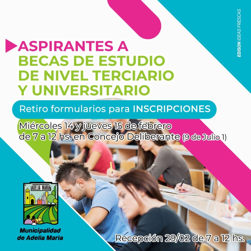 El Concejo Deliberante de Adelia María comunica que los días 14 y 15 de febrero de 7:00 a 12:00 hs. estarán disponibles los formularios para renovación de becas e ingreso de nuevos aspirantes, destinados a estudios superiores.