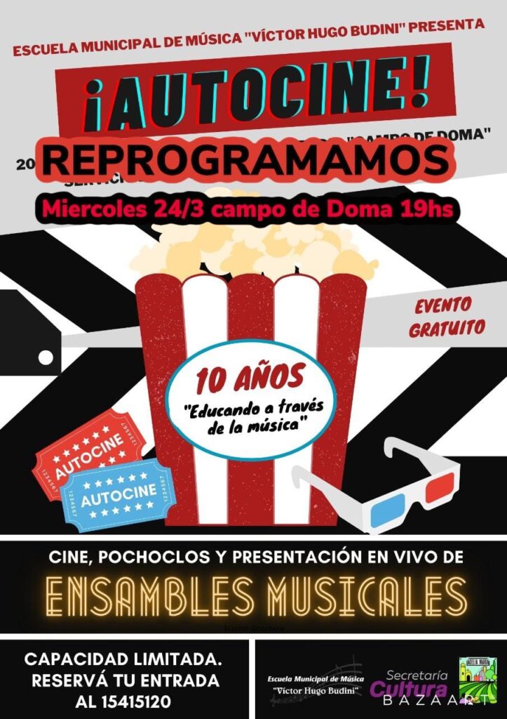 El miércoles 24 se realizará el Autocine en Adelia María. Es organizado por la Escuela Municipal de Música «Víctor Hugo Budini» y se realizará en el campo de doma desde las 19.