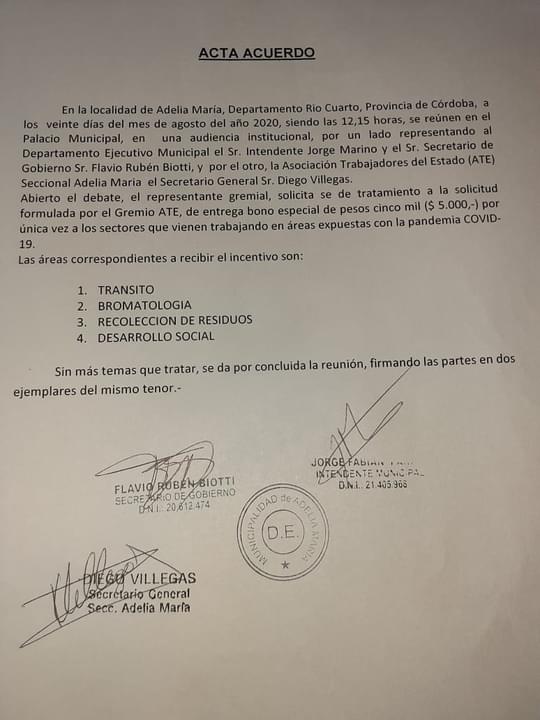 La seccional ATE Adelia María suscribió un acuerdo con las autoridades municipales de esa localidad de sur provincial para que los trabajadores de la primera línea contra la pandemia del Covid-19 que no recibieron el bono a nivel nacional, se vean beneficiados con ese estímulo.