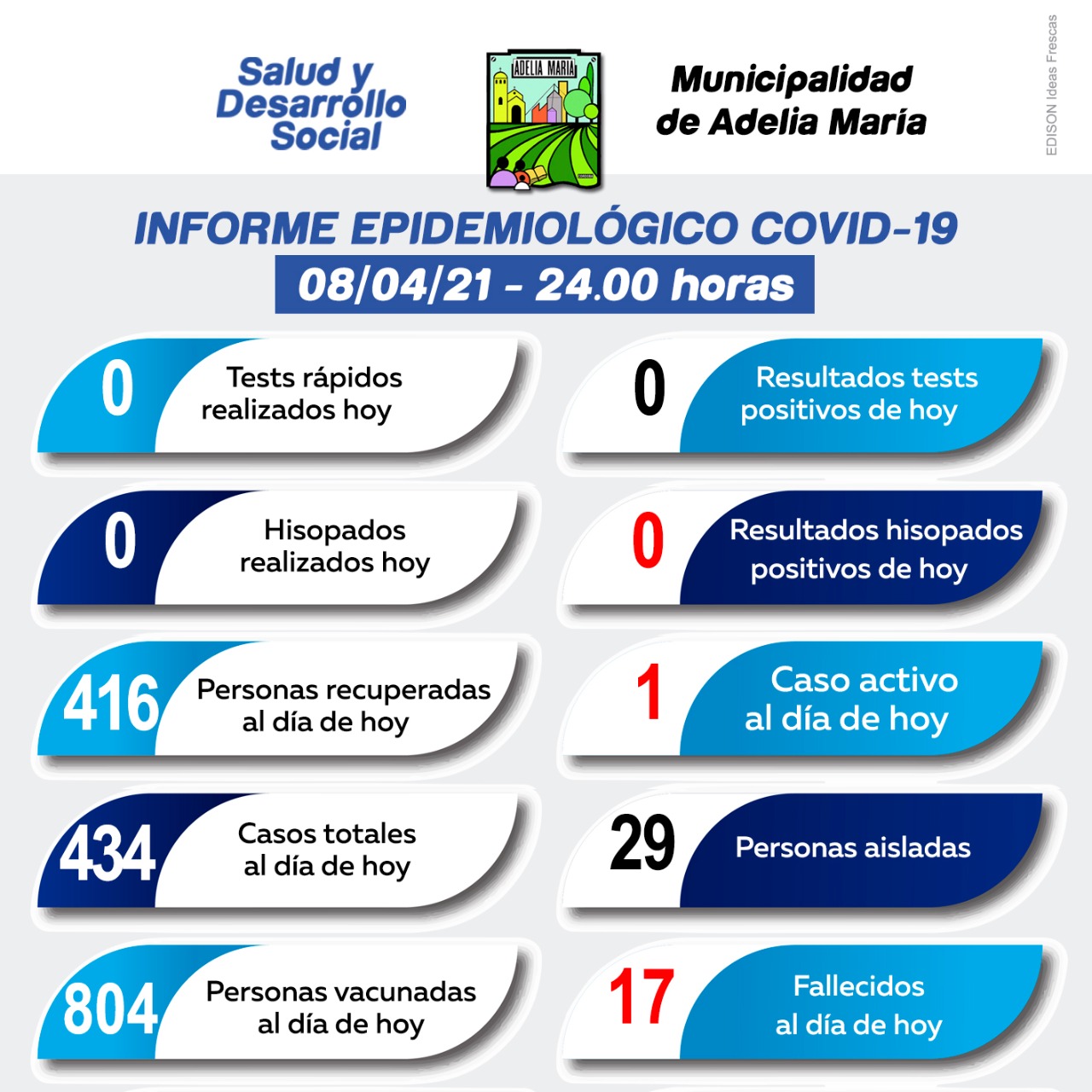 La Municipalidad de Adelia María informó que se registra un caso activo de coronavirus en la localidad.