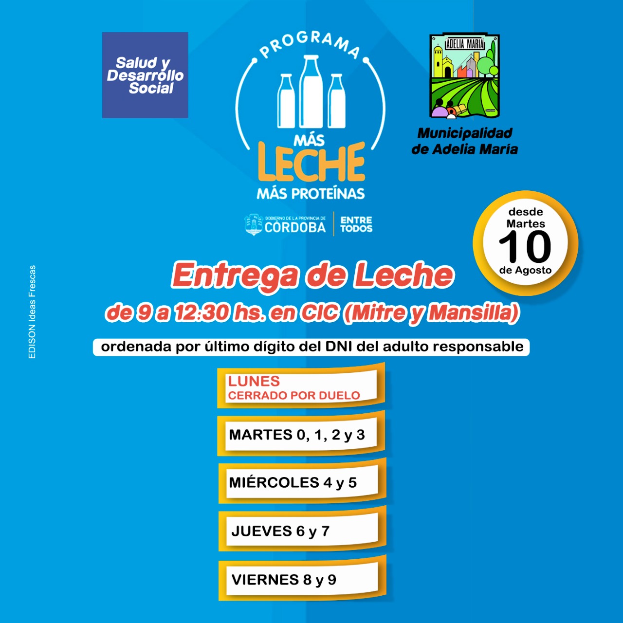 El Área de Salud y Desarrollo Social de la Municipalidad de Adelia María informa la reprogramación de la entrega de leche a niños de 4 a 10 años inclusive.