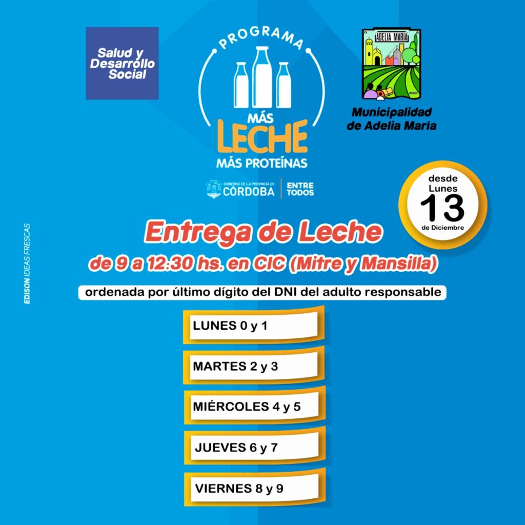 El Área de Salud y Desarrollo Social de la Municipalidad de Adelia María informa la entrega de leche a niños de 4 a 10 años inclusive en esta semana de diciembre.