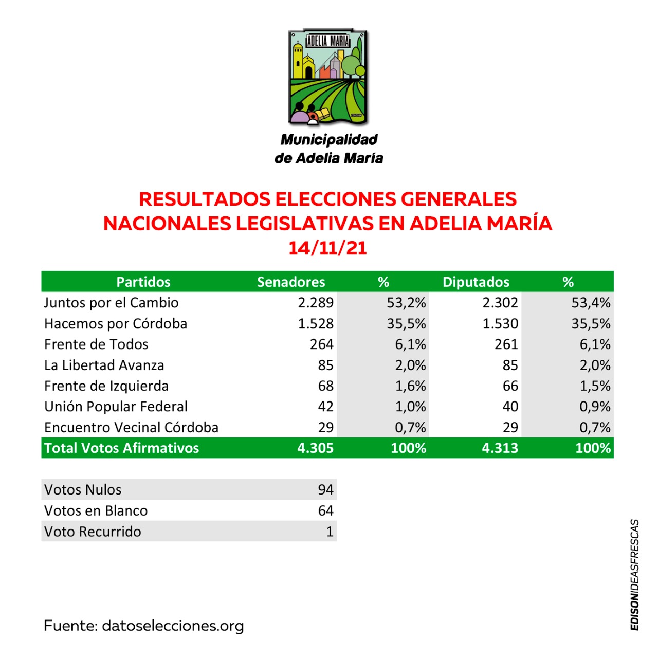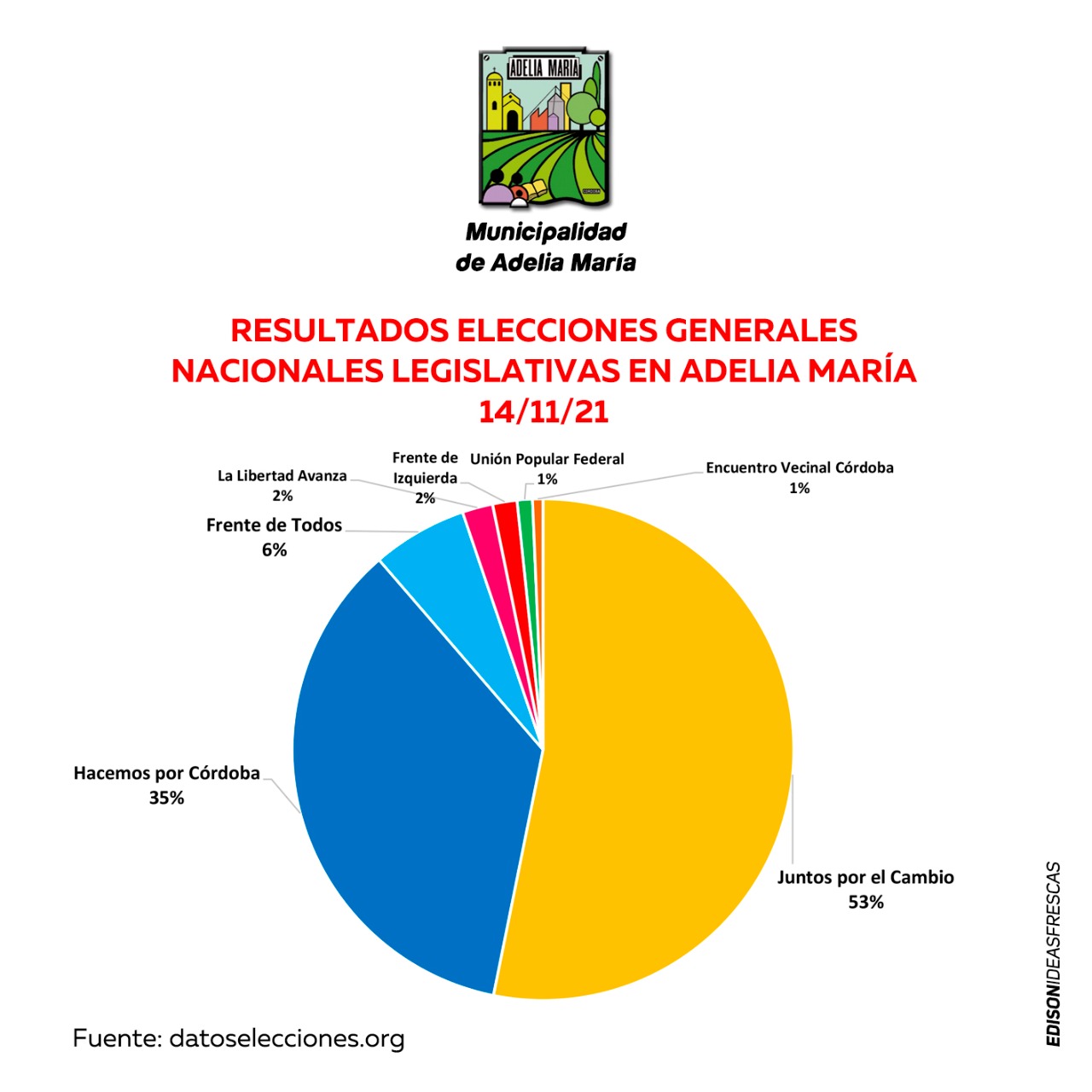 Juntos por el Cambio se impuso en Adelia María. Lo hizo con el 53,2% de los votos. En segundo lugar quedó Hacemos por Córdoba con el 35,5%.