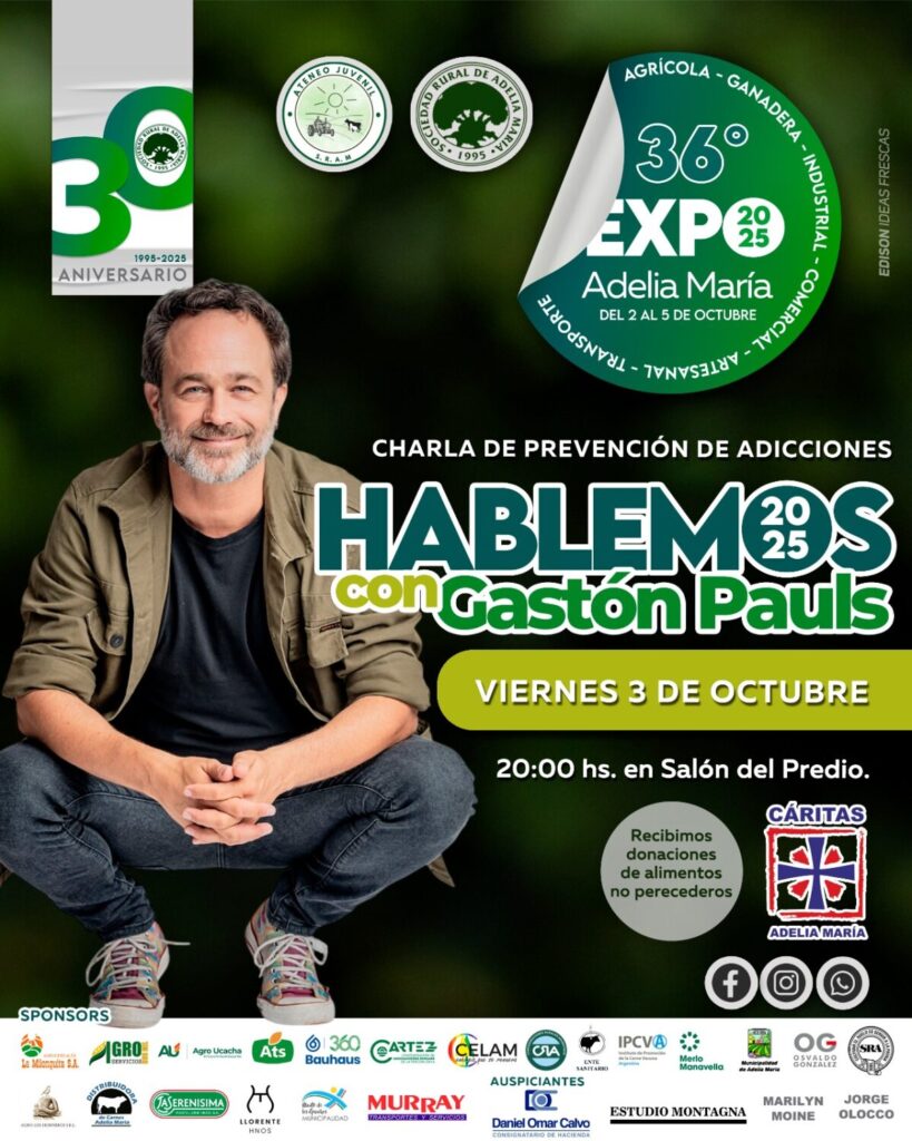 El ciclo de conferencias de la 36° Exposición de Adelia María contará con la charla de prevención de adicciones “HABLEMOS” a cargo de Gastón Pauls.