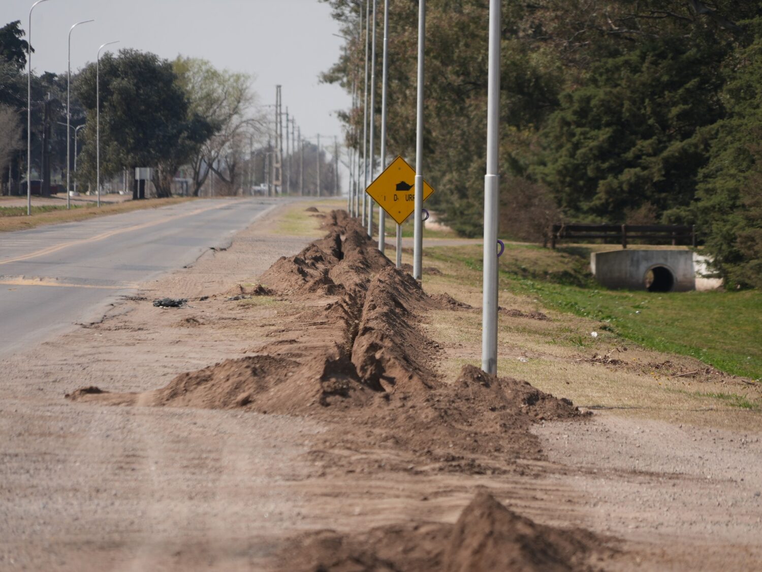 Colocación de cable subterráneo en columnas de luminarias LED en Ruta Provincial N° 24, entre Av. San Martín e IPEA N° 292 «Agr. Liliam Priotto».