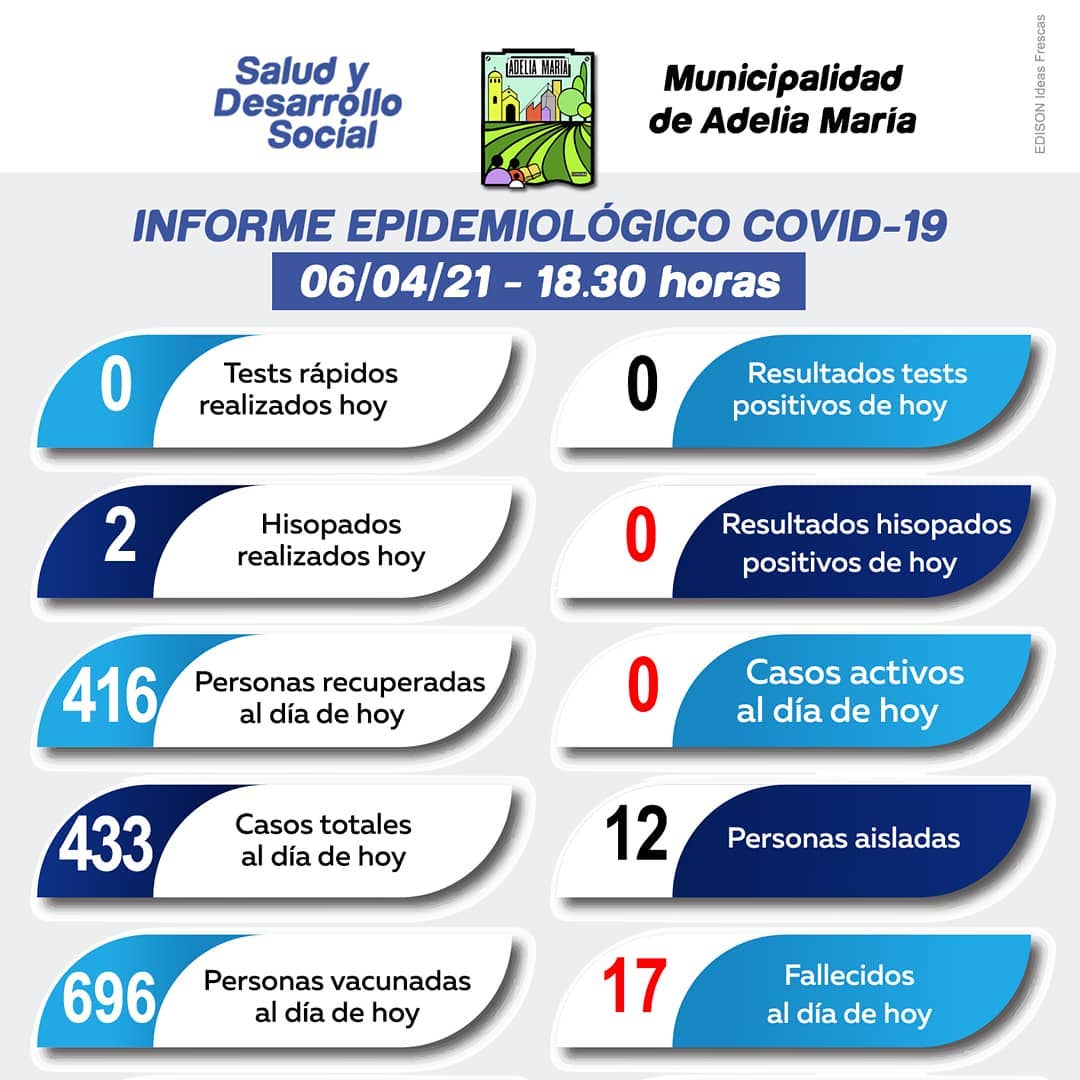 La Municipalidad de Adelia María informó que no quedan casos activos de coronavirus en la localidad.
