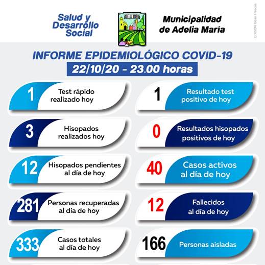 La Municipalidad de Adelia María informó que en la jornada del 22 de octubre no se registraron nuevos casos positivos de coronavirus.