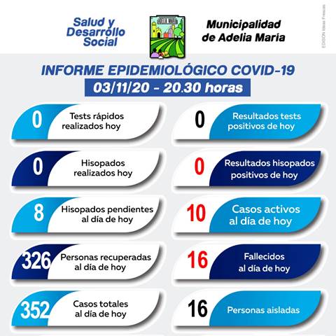 La Municipalidad de Adelia María informó que en la jornada del 3 de noviembre no se han registrado nuevos casos positivos de Covid-19.