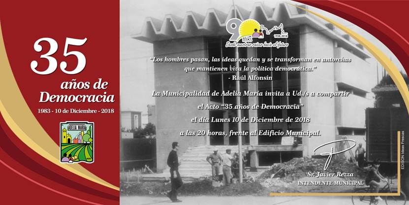 Hoy, 10 de diciembre, se celebra el Día de la Restauración de la Democracia, por tal motivo la Municipalidad de Adelia María realizará un acto conmemorativo que está previsto comience a las 20, frente al edificio municipal.