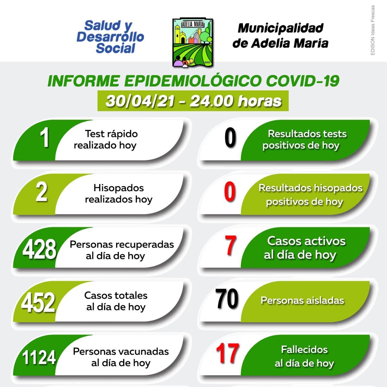 La Municipalidad de Adelia María informó que hay siete casos activos de coronavirus en la localidad.