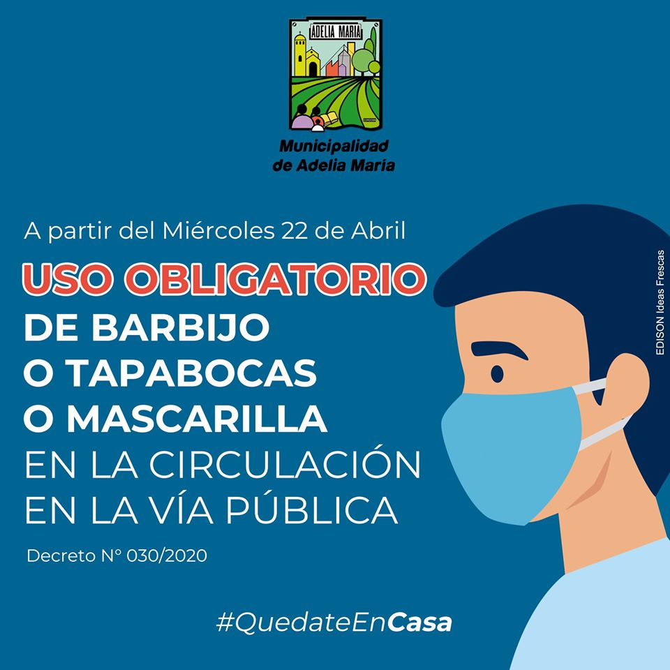 El intendente municipal de Adelia María, Jorge Marino, determinó que será obligatorio el uso de barbijo o tapaboca en la localidad.