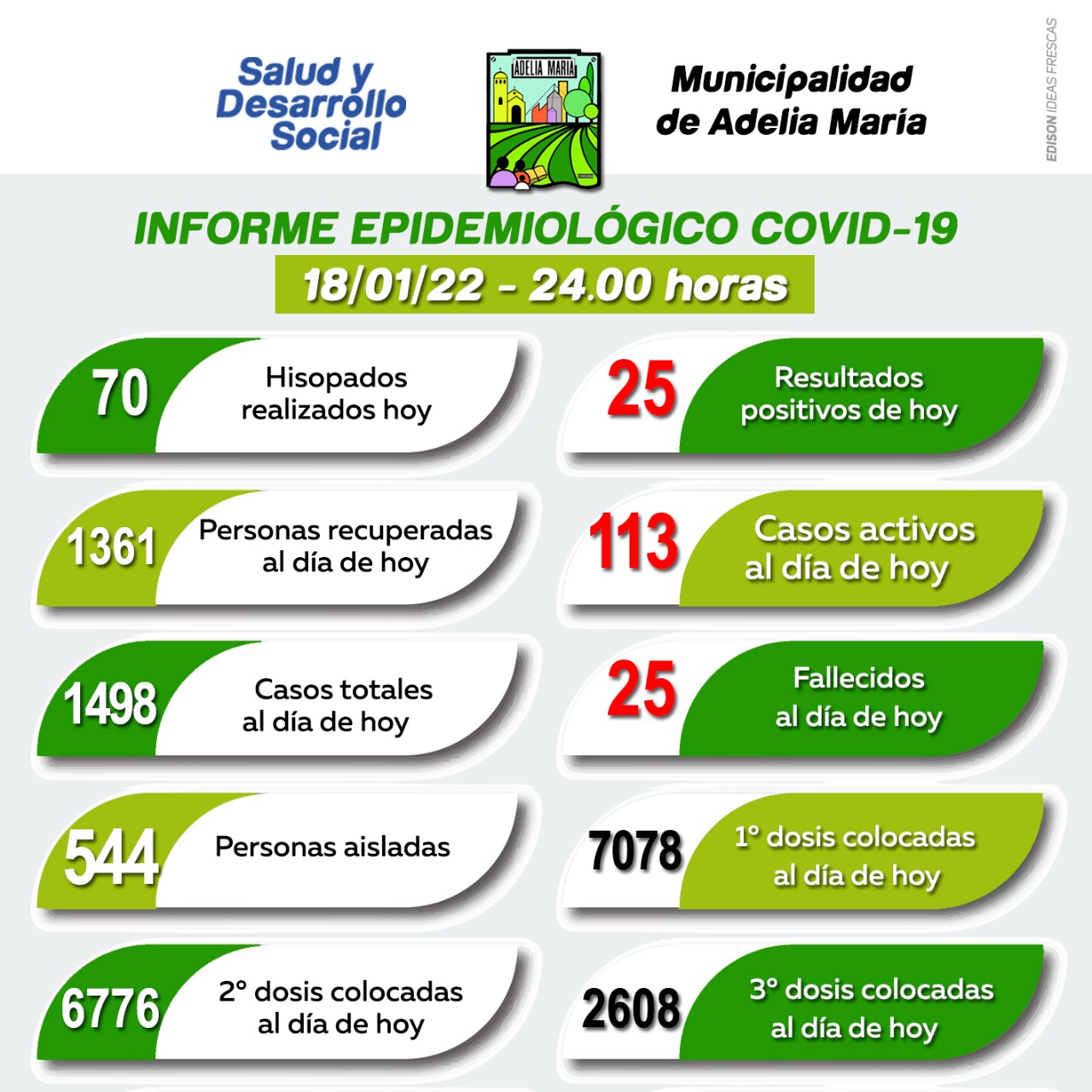 La Municipalidad de Adelia María informó que en la jornada de ayer se han detectado 25 nuevos casos positivos para Covid-19.