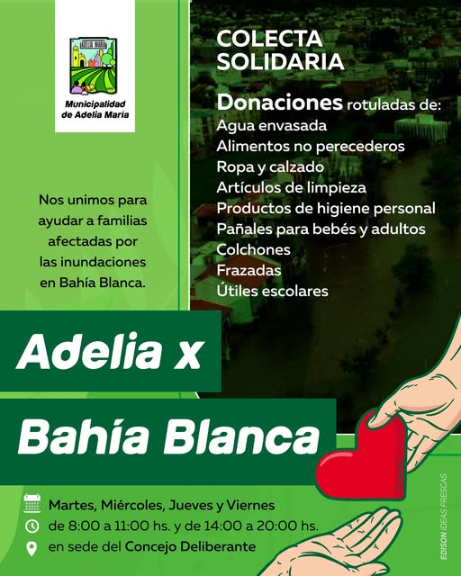 El Concejo Deliberante de Adelia María organiza esta Colecta Solidaria, durante los días martes, miércoles, jueves y viernes, en su sede sita en 9 de Julio 1.