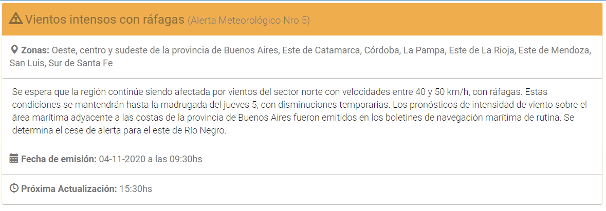 El Servicio Meteorológico Nacional (SMN) renovó esta mañana una alerta por vientos intensos con ráfagas para el oeste, centro y sudeste de la provincia de Buenos Aires, este de Catamarca, Córdoba, La Pampa, este de La Rioja, este de Mendoza, San Luis y sur de Santa Fe.