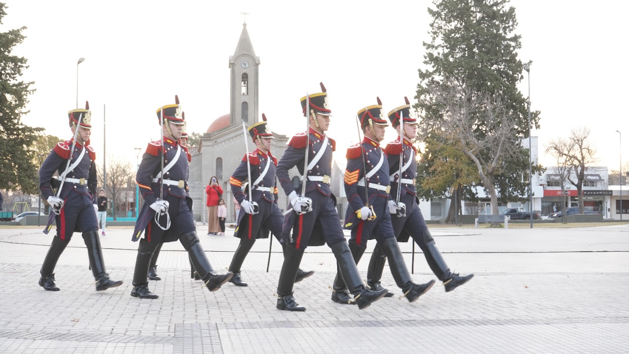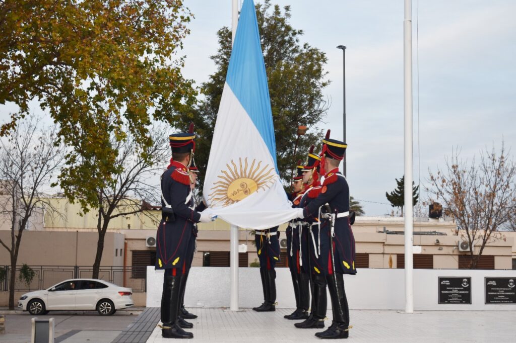 Los siete representantes de la Guardia de Honor del Regimiento de Ganaderos a Pie General San Martín de Buenos Aires, que recorrieron establecimientos educativos de la localidad para acompañar en los diferentes actos conmemorativos al 25 de Mayo, realizaron la ceremonia de arrío de la Bandera Nacional en la Plaza Domingo F. Sarmiento.