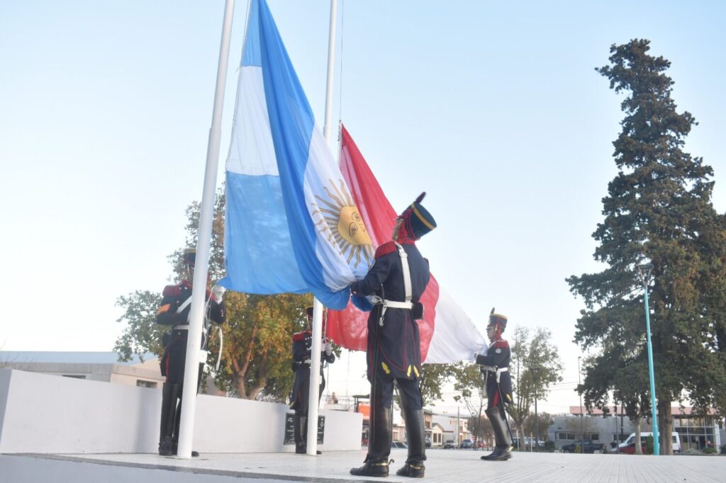 Esta tarde, una delegación del Regimiento Granaderos a Caballo General San Martín visitó Vicuña Mackenna y participó en el acto de arriar la Bandera Nacional en la Plaza Domingo Faustino Sarmiento.