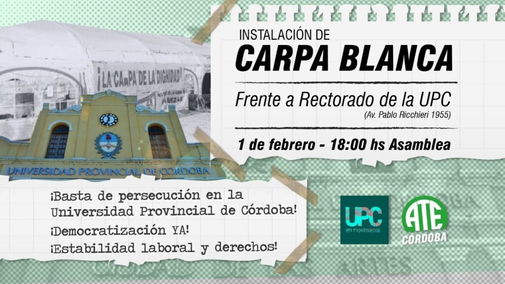 Hoy, ATE Córdoba, instala la «Carpa por la Democracia, el Trabajo y los Derechos Humanos» frente a la Universidad Provincial de Córdoba.