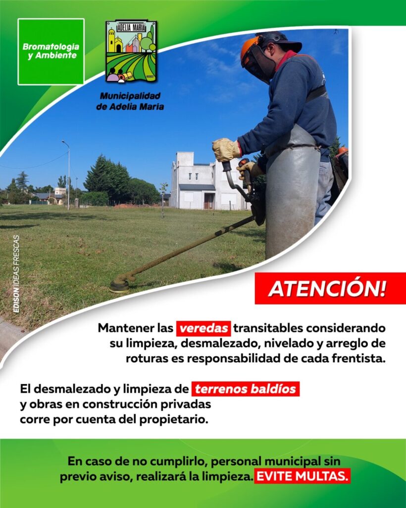 La Municipalidad de Adelia María publicó un pedido a los vecinos de la localidad de mantener, en estos días inestables, las veredas limpias y arregladas.