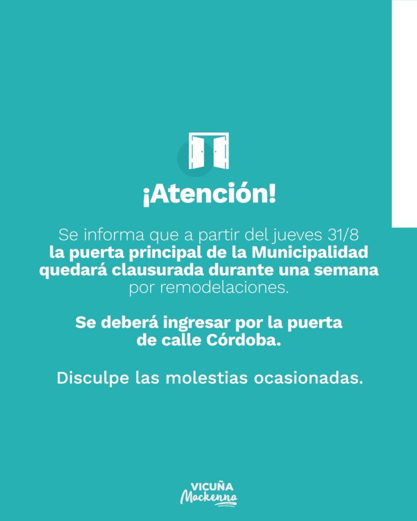 La Municipalidad de Vicuña Mackenna informó que la puerta principal del Municipio se encontrará clausurada.
