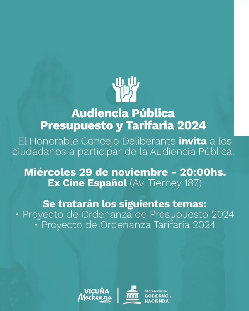 El Miércoles 29 se realizará la audiencia pública para discutir cuales serán los presupuestos y tarifarias 2024 en Vicuña Mackenna.