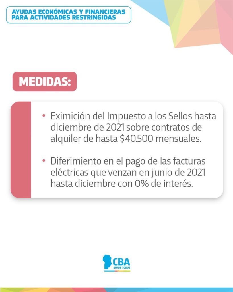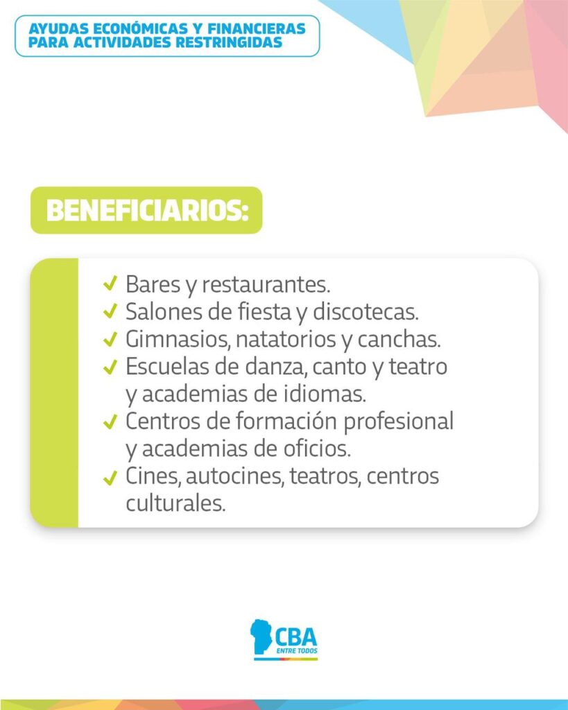 * Los interesados deben completar el formulario «ayuda directa por restricciones en la actividad» en la página web www.cba.gov.ar con ciudadano digital nivel 2, declarar cuánta bancaria a nombre del solicitante, estar inscripto en la DGR en alguna de las actividades restringidas y haber presentado declaración jurada de ingresos brutos.