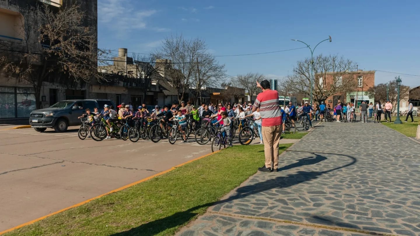 Desde la Plaza Domingo Faustino Sarmiento, cientos de vecinos de todas las edades se sumaron a la propuesta de recorrer en bicicleta las principales calles del pueblo, acompañados por el Cura Párroco Padre Pablo Silvetti, el locutor Cristian Cento y su equipo de trabajo, y el intendente Luciano Portalupi.