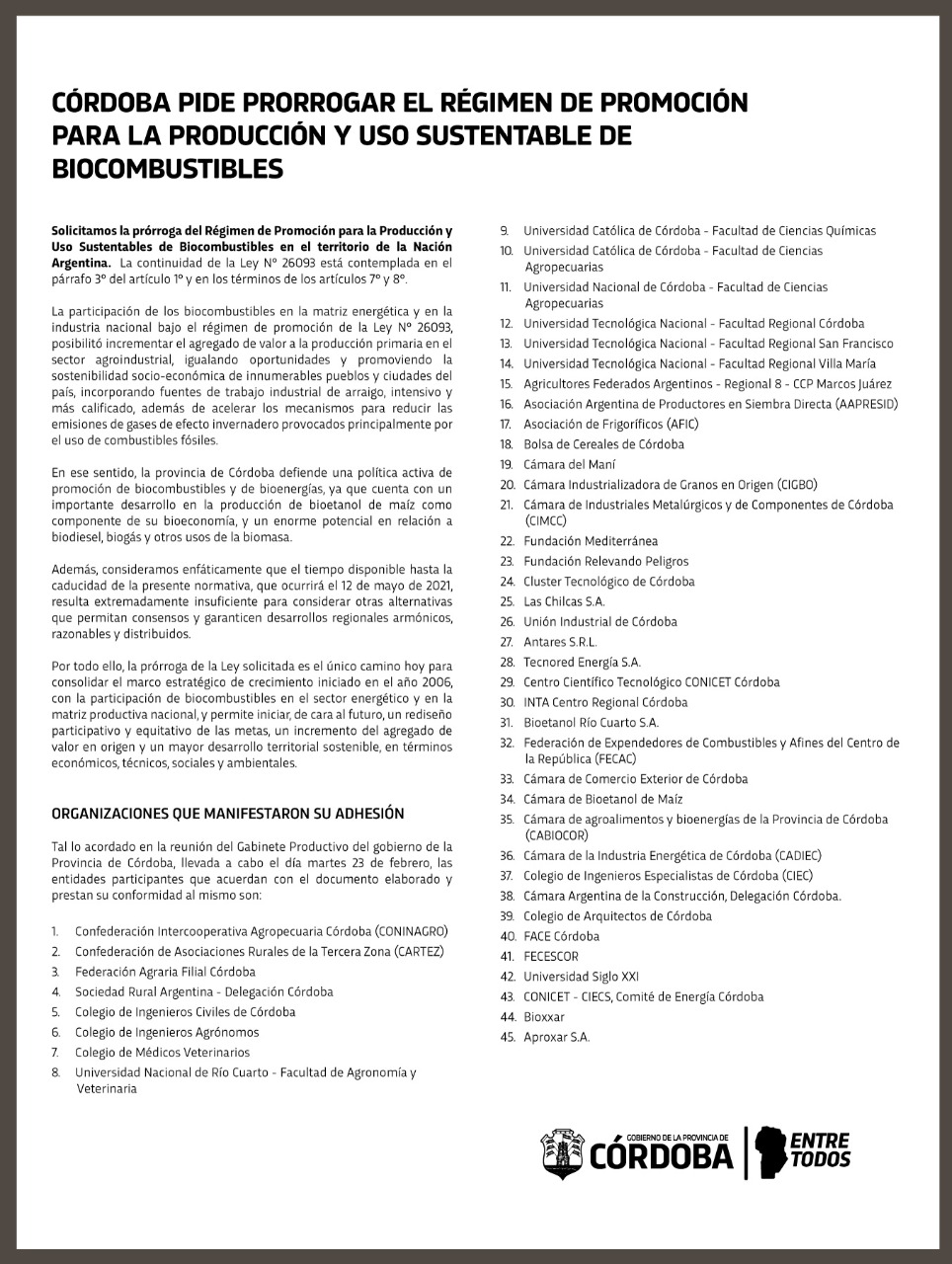 Este pedido se viene realizando desde hace tiempo, y esta vez se reitera con el acompañamiento de un amplio sector. La provincia cuenta con un importante desarrollo en la producción de bioetanol de maíz como componente de su bioeconomía, y un enorme potencial en relación al biodiesel y otros usos de biomasa, ejes que se detallan en la solicitud.