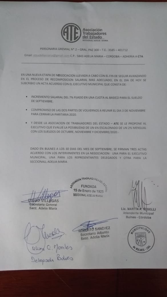 La seccional Adelia María representada por el secretario general, Diego Villegas, el secretario adjunto, Roberto Sánchez, secretario adjunto y la delegada del municipio, Liliana Morales, acordaron, el pasado 30 de septiembre, un aumento salarial del 7% que se suma a lo ya firmado dando como suma final un 29, 79%.
