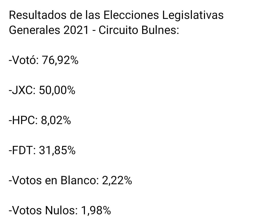 En Bulnes se impuso Juntos por el Cambio con el 50% de los votos. En segundo lugar quedó el Frente de Todos con el 31,85%.