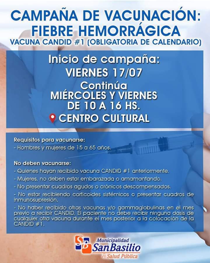 Salud Pública informa fechas y horarios para la campaña de vacunación contra la fiebre hemorrágica.