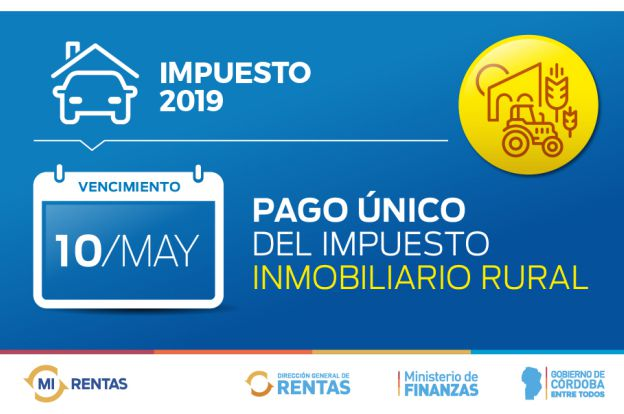 La Dirección General de Rentas informa que el próximo viernes 10 de mayo, vence el Pago Único del Impuesto Inmobiliario Rural 2019. Esta modalidad tiene el beneficio del 10 % de descuento, que se suma al resto de los beneficios vigentes: