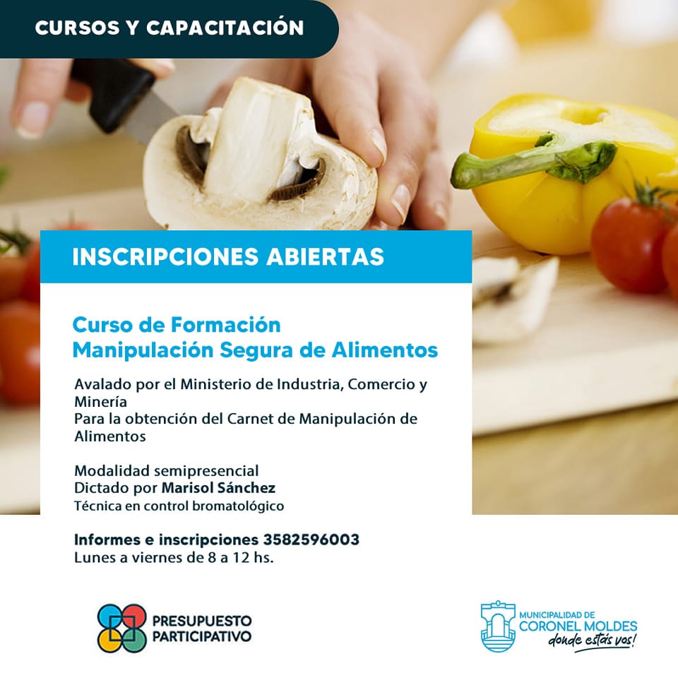 La Municipalidad de Coronel Moldes dictará el curso de capacitación en Manipulación de Alimentos, necesaria para la obtención del carnet de Manipular de Alimentos.