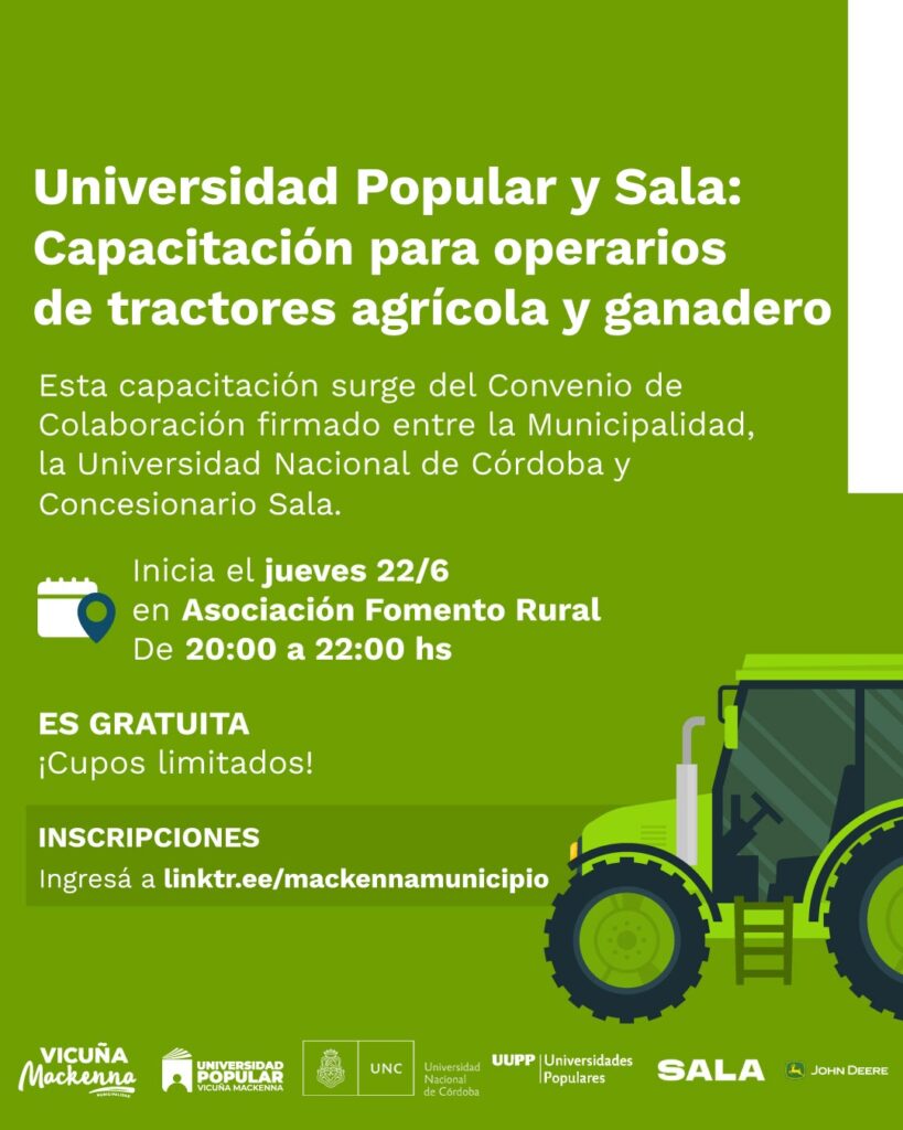 La Universidad Popular y Sala organizan capacitación para operarios de tractores agrícolas y ganaderos, el próximo Jueves 22 de Junio a las 20 hs, en Vicuña Mackenna.