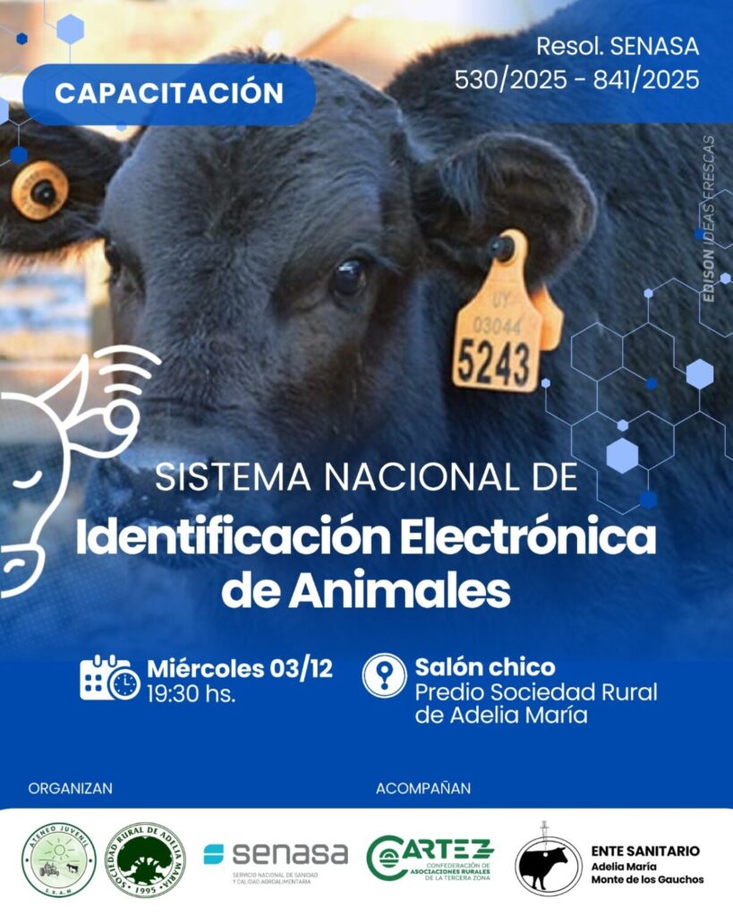 La Sociedad Rural de Adelia María junto a su Ateneo Juvenil y SENASA invitan a los productores ganaderos y médicos veterinarios de la localidad y zona, a la charla informativa sobre el nuevo sistema de caravana electrónica que comenzará a regir a partir del 1° de enero de 2026.
