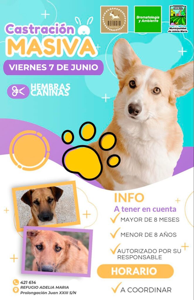 El Área de Bromatología de la Municipalidad de Adelia María informa que el viernes 7 de junio llevará a cabo la castración de hembras caninas mayores de 8 meses y menores de 8 años.