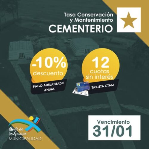 24 enero, 2025La Municipalidad de Monte de los Gauchos te recuerda que el viernes 31 de enero vence la Tasa de Conservación y Mantenimiento de Cementerio. Podés pagarla accediendo a estos beneficios […]